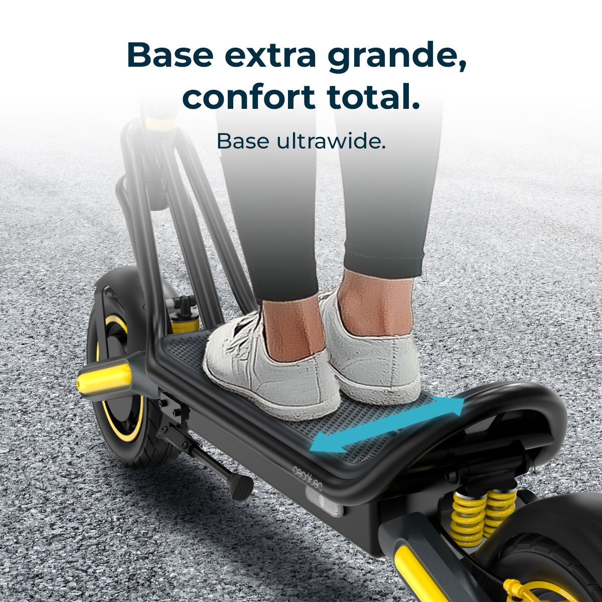 - Plataforma (base):Tipo: UltrawideCaracterísticas: Superficie antideslizante, mayor área de apoyo para mejorar la ergonomía y la estabilidad del usuario.Beneficios: Reduce la fatiga en trayectos largos y mejora el control en maniobras.